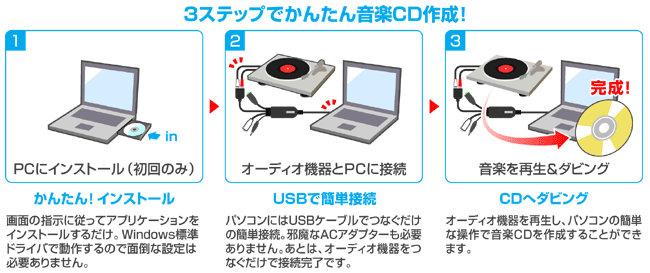 「AD-USB」は、パソコン初心者の方でも安心!3ステップで簡単に音楽CDを作ることができる。