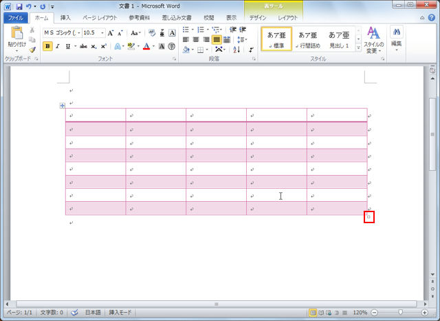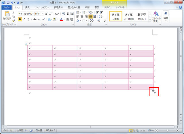作成した表にマウスポインターを合わせると、右下に□マークが表示される(画面1)。□マークにマウスポインターを合わせると、ポインターが両矢印の形状に変化するので(画面2)、そのままドラッグする。