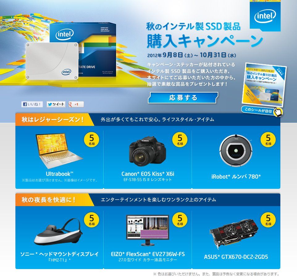 キャンペーン内容は、シリアル番号を記載したステッカーが添付されているインテル製SSD製品を対象店舗で購入し、キャンペーン・サイトから応募すると抽選で豪華賞品が当たる。Ultrabook、デジタル一眼、お掃除ロボット「ルンバ」、ヘッドマウントディスプレイ(HMD)、27インチ液晶ディスプレイ、ハイエンドグラフィックスカードといった豪華賞品になっている。