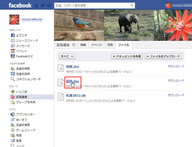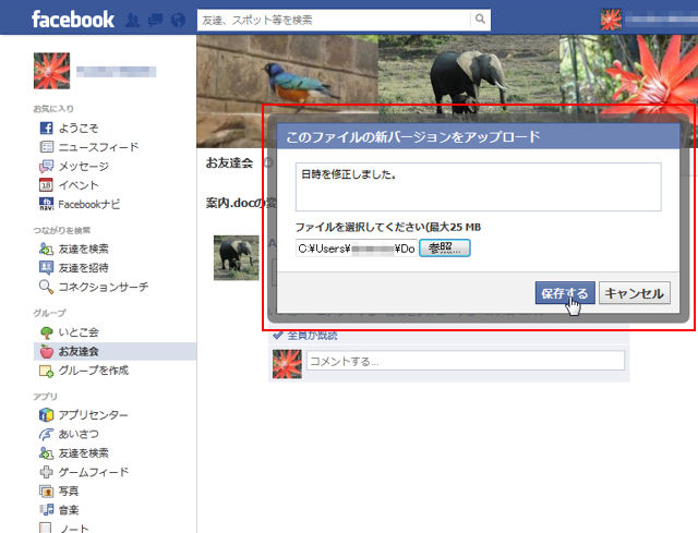 以前Facebookでは、グループにファイルをアップロードすることができることを紹介した(Facebookでファイルを受け渡ししよう)。このファイルに誰かが変更を加えた時、新たにアップロードしてしまうと、どれが最新のものかが分かりづらくなってしまう。こういう場合は、ファイルを更新しよう。