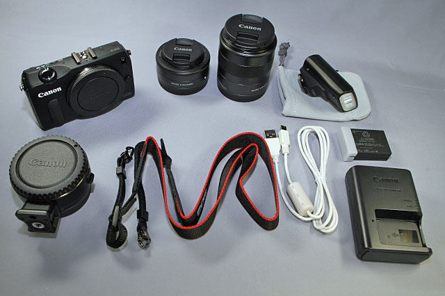 | 内容物を並べてみた。「EOS M」本体のほかに、EF-M22㎜ F2 STM、EF-M18-55㎜ F3.5-5.6 IS STM、マウントアダプター EF-EOS M、スピードライト 90EX、バッテリーパックLP-E12、充電器、USBケーブルが同梱される。 |