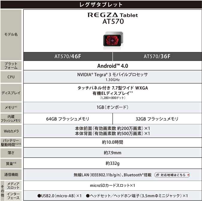 2012年の東芝のREGZA Tabletは、液晶テレビ「REGZA」で培った高い映像技術や、ノートPC「dynabook」のサウンド技術を採用することにより、東芝ならではの高画質・高音質を実現したタブレット製品となっている。