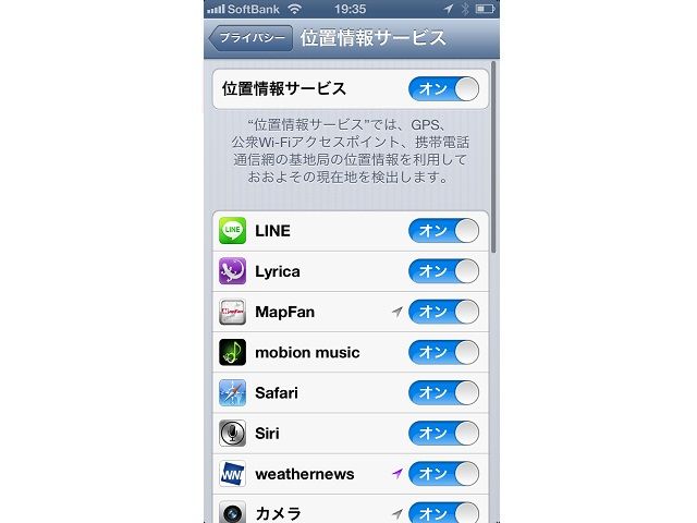 | 画面3 位置情報を利用するアプリを一覧して、個別にオン/オフを設定できる。心配なら、「位置情報サービス」からまとめてオフにできる。 |