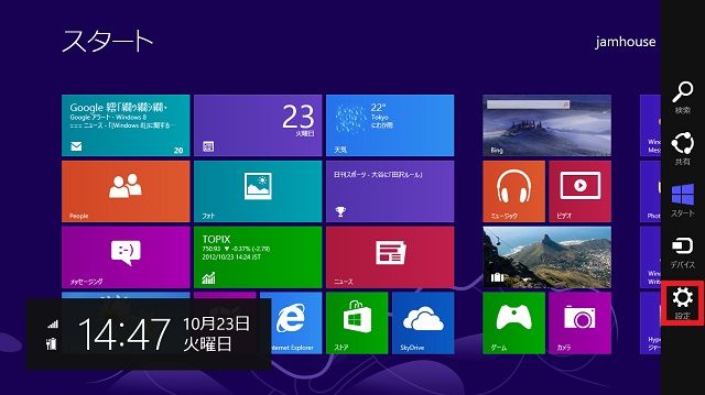 | 画面2 チャームバーが表示されたら、[設定]をタップする。 |