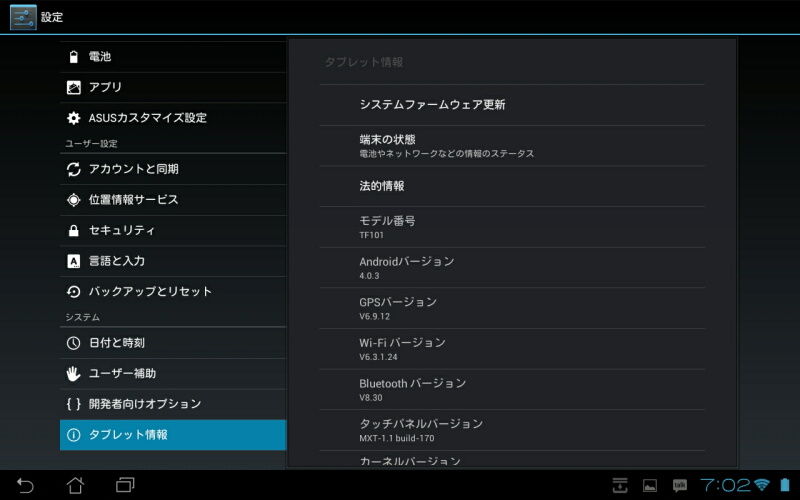 Androidのバージョンは4.0.3にアップデートが可能。設定画面の構成はタブレット向けの2カラム表示