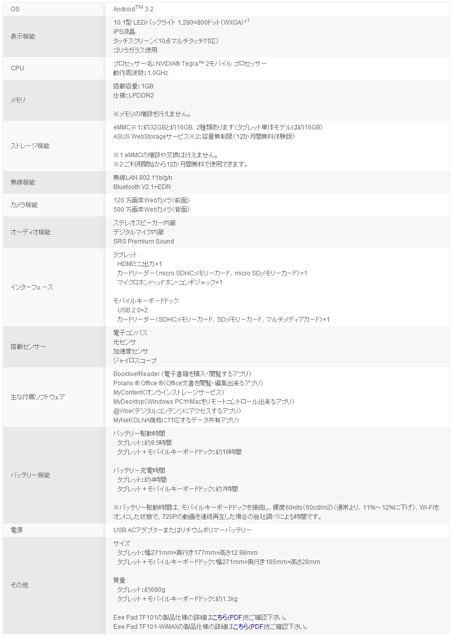 CPU:NVIDIA Tegra 2モバイル プロセッサ/1.0GHz
