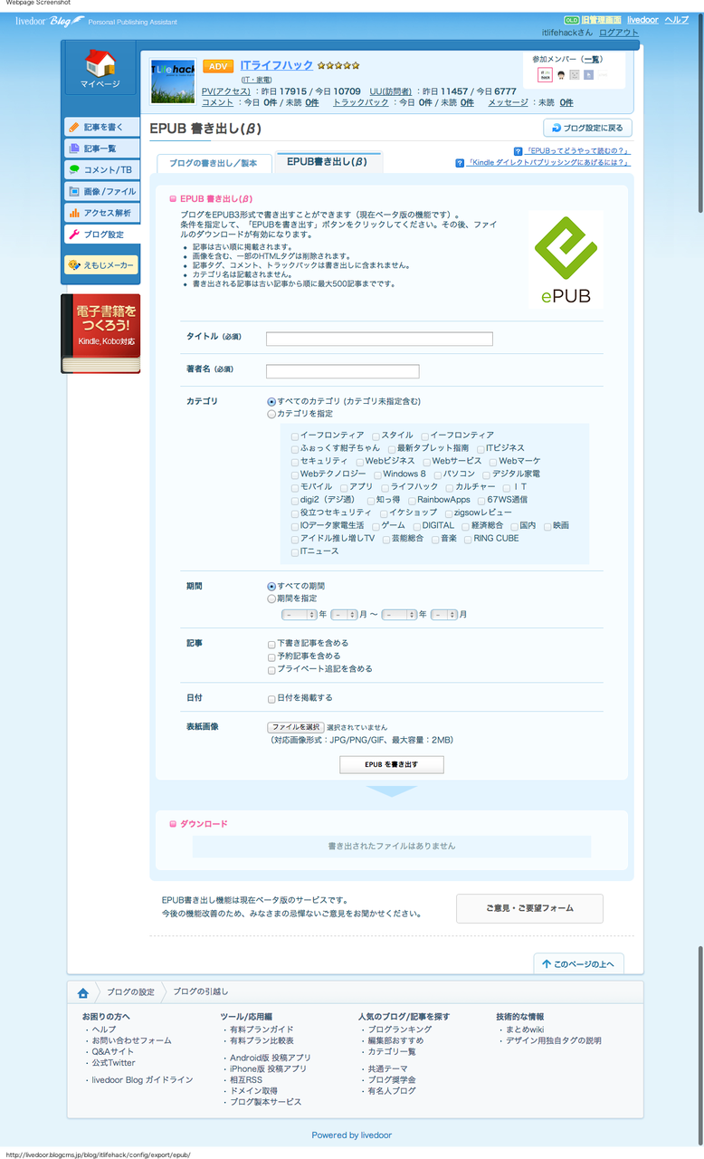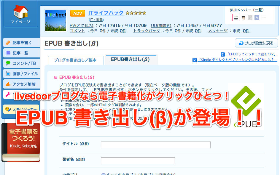 それでは、livedoorブログの新機能「EPUB書き出し機能」を使った電子書籍発行の方法を解説していこう。
