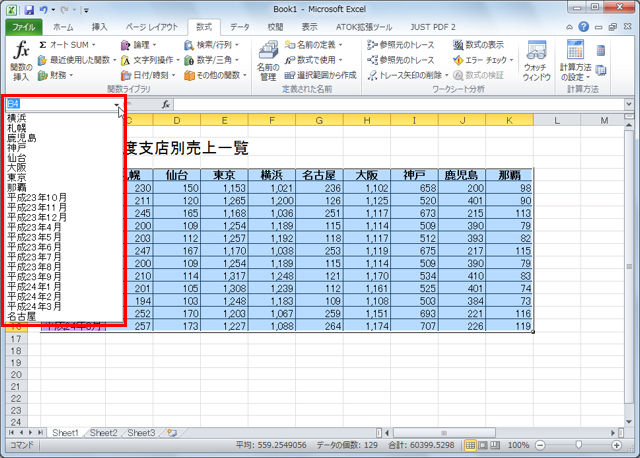 これで名前が設定された。[名前ボックス]の▼をクリックすると、ちゃんと名前が設定されていることが分かる(画面3)。