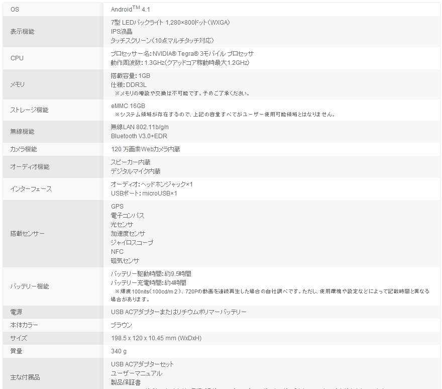 CPU:NVIDIA Tegra 3モバイル プロセッサ/1.3GHz(クアッドコア稼動時最大1.2GHz)