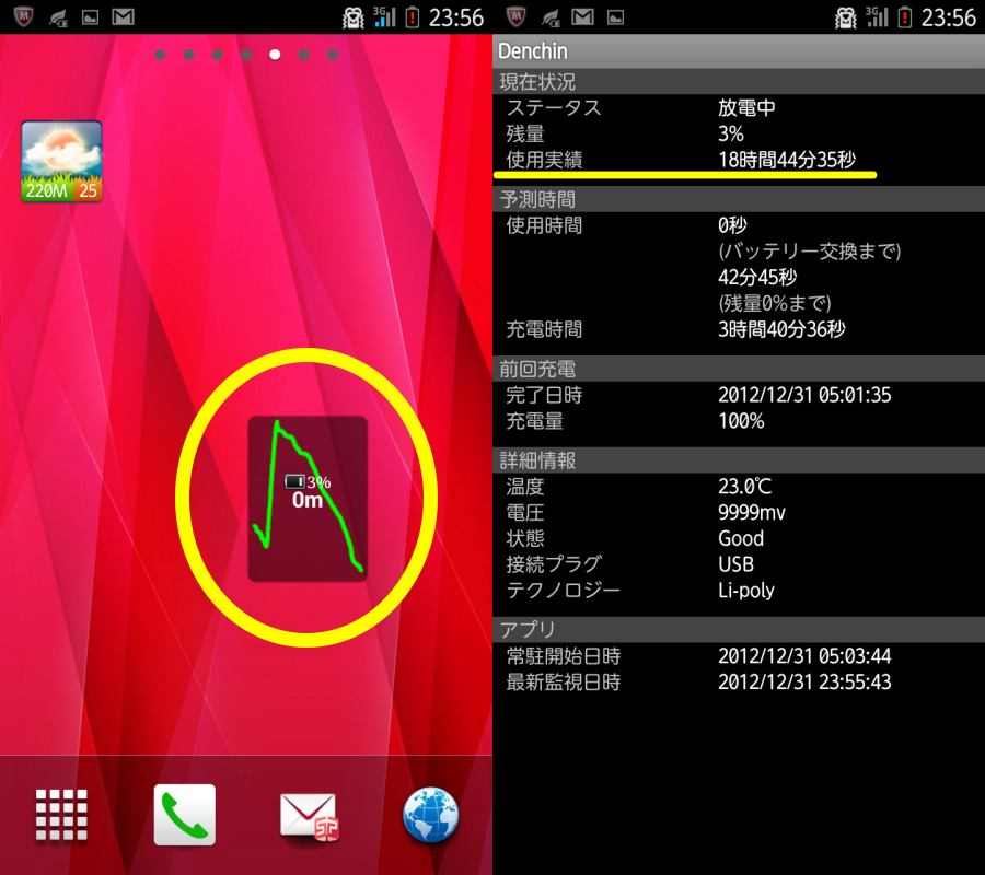 また、BATTERY POWER+は数日してから、効果が出てくるという話だったので、まずは貼った状態でそのまま数日間利用して計測。その後、BATTERY POWER+を取り外して計測した。工場出荷状態にリセットして画面の明るさなどなるだけデフォルト状態、マチキャラ、Google検索窓と、タスク管理の「ESタスクマネージャー」、バッテリーの状態を確認するためのアプリ「Denchin」以外のウィジェットはホーム画面から削除している。