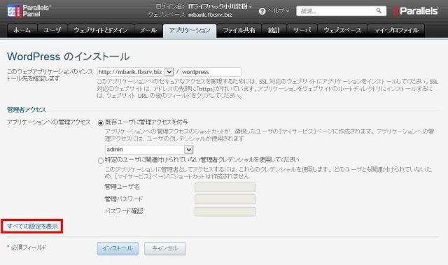 | WordPressにある「インストール」をクリックする。 |