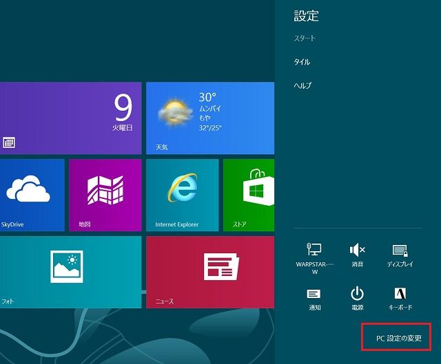 | 画面1 [設定]チャームの[PC設定の変更]をタップ。 |