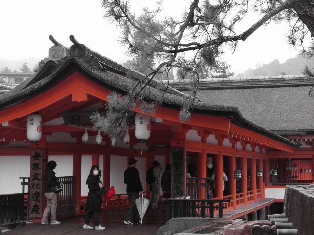 もうひとつおススメなのが「色分解(赤色)」とした厳島神社社殿の作品(「霧雨 64mm F4.9 1/50sec ISO100」)だ。赤色以外がモノクロで撮影できる。