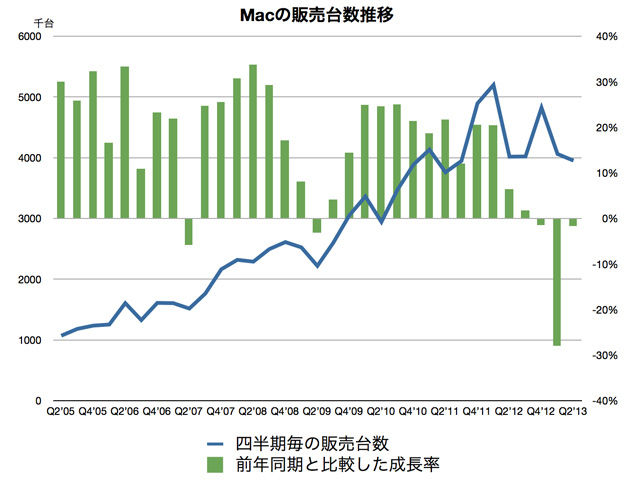 具体的には2012年10月から12月のMacの販売台数は406万台。2013年1月から3月は395万台と約11万台落ちている。これだけなら季節的な要因も含まれるので、前年同期で比較すると2012年1月から3月は402万台なので、同時期で比較しても約7万台の減となる。