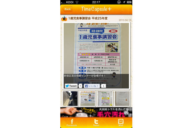 さらに、未閲覧の新規投稿があると、その写真と枚数を教えてくれる。児童館のイベントお知らせや、町内会の掲示板、大学の就職課の張り紙など、わざわざその場所に行かなくても、タイムカプセルユーザの誰かがアップすれば情報を共有することができる。町内会で個別に回し合う回覧板もタイムカプセル+があれば、その代わりができるだろう。