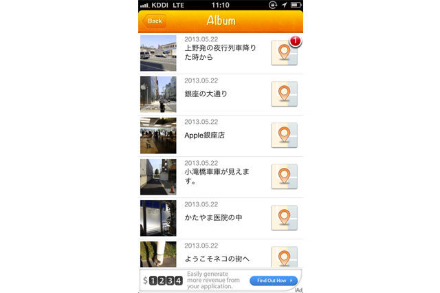 タイムカプセル+の利点は、iPhone内蔵のGPS機能を利用することによって、写真を撮った場所の位置情報まで記録できる点にある。その結果、写真を地図上の位置と符合させることができ、その場所に関連した情報を記録できる。システム的には、単純に思えるかもしれないが、この単純さゆえに無限の可能性がある。