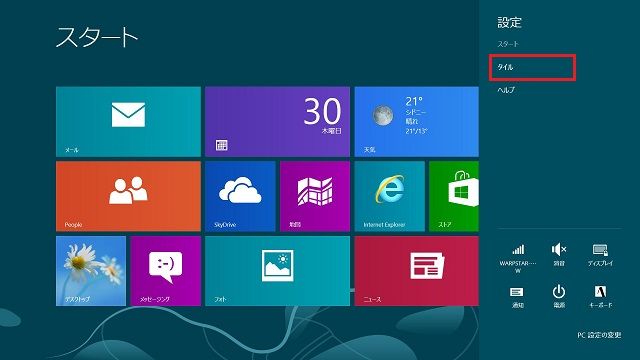 | 画面1 スタート画面を表示した状態で、チャームを表示し、「設定」をタップ。「設定」メニューの「タイル」をタップする。 |