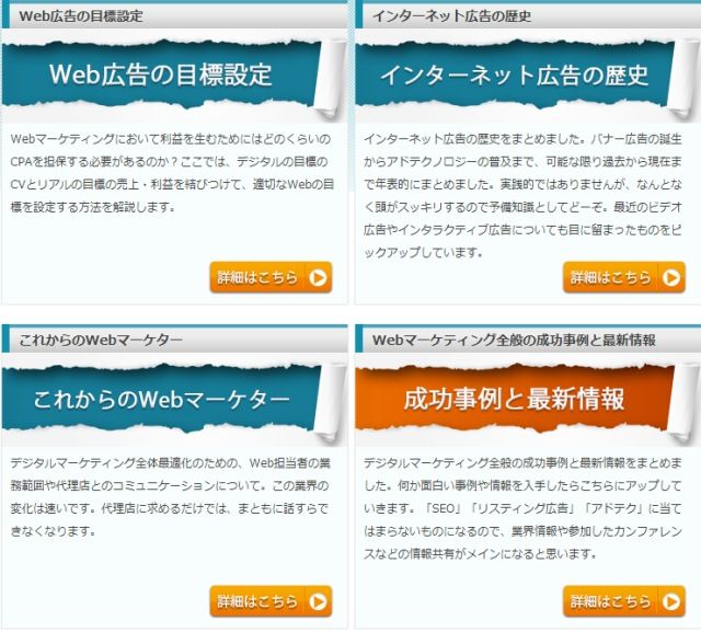 このサイト、Webマーケティング全般に関する知識、SEO対策、リスティング広告、アドテクノロジーといったように、それぞれのカテゴリーに分類されており、さらにそれ以下にも分類が用意されており、非常に分かりやすくまとめられている。