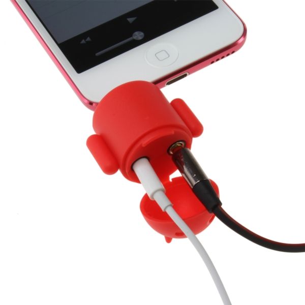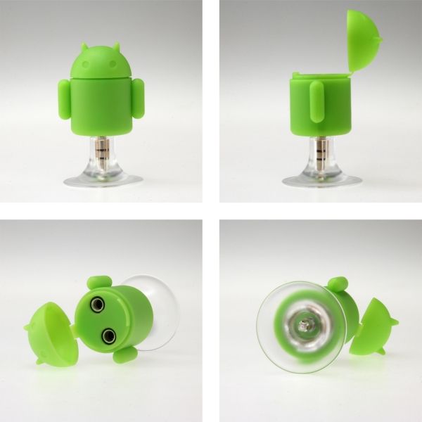 写真を見てもらえばわかるが、Android OSのキャラクターであるロボットの「ドロイド君」非常によく似ているスマホ用アクセサリーが登場した。上海問屋が販売しているグッズだが、iPhoneやスマホのイヤホンジャックに差してステレオミニプラグを2つに分岐してくれるジャック機能を持ち、吸盤を使ってスマホの裏面に貼り付けることでスタンド機能にもなってくれるロボット型アクセサリーが登場した。