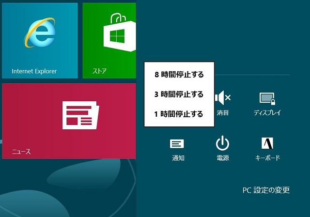 Windows 8では通知を完全に停止することも可能だが、ふだんはメールの着信をチェックしたいという場合には設定を戻すことになる。作業中などに通知機能を一時的に停止するだけなら、チャームの設定画面から時間を設定しよう(画面1、2)。