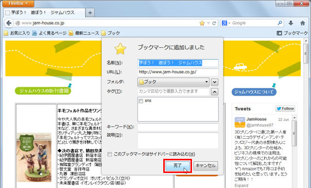 [ブックマークに追加しました]というウィンドウが表示されるので、[完了]をクリックする(画面2)。