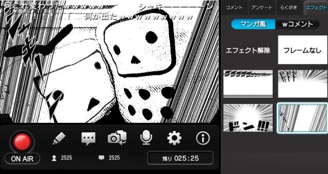 「マンガ風」と「wコメント」があり、配信画面に加工できる。