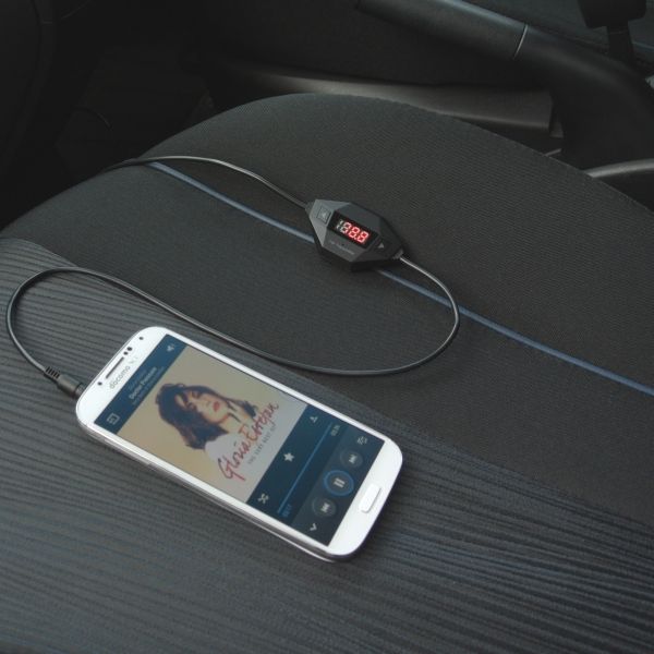AUXなどの外部入力端子がカーオーディを取り出さないとアプローチできないようなケースでは、昔ながらのFMトランスミッターは便利だ。iPhone等の各種スマートフォンのイヤホンジャックにプラグを差し、本体が出す周波数を選択、車のFMラジオの周波数を本体周波数と同じに合わせれば音楽が流れてくる。ラジオしか搭載していないレンタカーなどでもスマホの音楽を楽しむことができる。