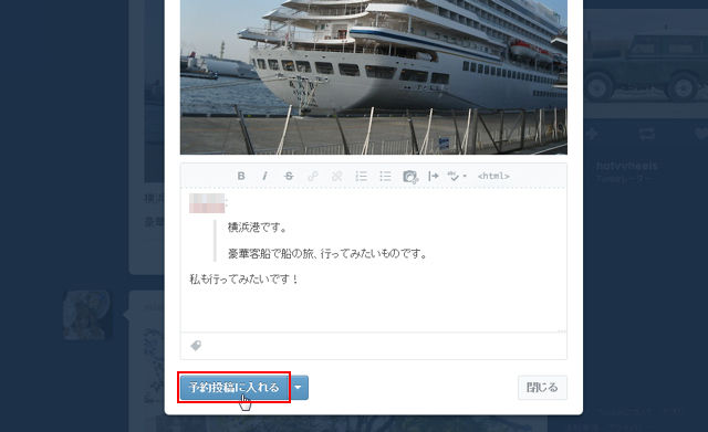 Tumblrで投稿、リブログする際に、[公開]、もしくは[リブログ]の横の▼をクリックし、[予約投稿に追加]をクリックする(画面1)。