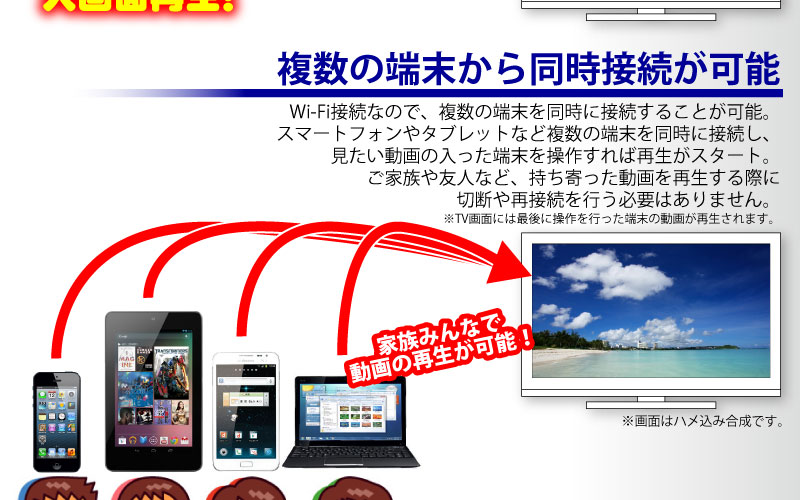 ネットワークプレイモードは、Wi-Fi接続なので複数の端末を同時に接続することが可能になっている。たとえばスマートフォンやタブレット、パソコンなど複数の端末を同時に接続し、見たい動画の入った端末を操作すればすぐに再生がスタート。皆で持ち寄った動画を再生する際に切断や再接続を行う必要はなく、TV画面には最後に操作を行った端末の動画が再生されるようになっている。