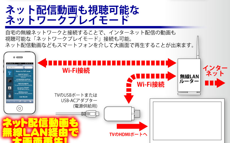 もう1つの方法が自宅の無線ネットワークにiPushを参加させる「ネットワークプレイモード」だ。このモードだと複数の端末からiPushにアクセスすることができる。またインターネット配信の動画も視聴可能だ。特定の端末でしか閲覧できないネット配信動画などもスマートフォンを介して大画面で再生することができる。