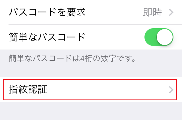 | 画面2 [パスコードと指紋認証]をタップする。この後、セットアップの際に登録したパスコードを入力する。 |