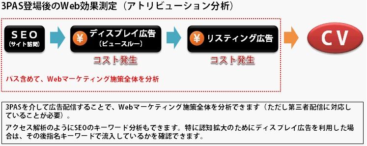 3PASは効果測定に強いと説明したが、実はその効果測定の結果をどう分析するのか? ということが非常に重要だ。そこでアトリビューション分析なのである。アトリビューション分析とは、直接コンバージョン以外の間接コンバージョン(ビュースルーCVや広告クリック後に離脱、さらに別経路からのCVといった)も含めて、コンバージョンへの広告の貢献度を正当に評価するための分析手法だ。3PASのためのアトリビューション分析、アトリビューション分析のための3PASというほど密接な関係にある。