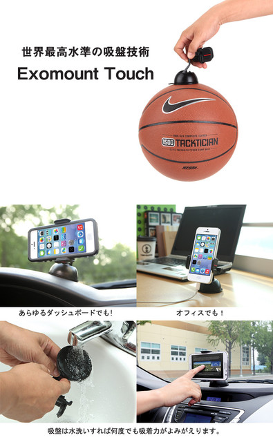 「ExoMount Touch」は、旧製品に使われていた吸盤の性能を大幅に向上させているのもポイントだ。以前は取り付ける場所が平滑である必要があったが、最新の吸盤は、バスケットボールのような球面や、マットな質感の表面にも変わらぬ吸着力を発揮するようになった。これによりこれまで取り付けが難しかった、湾曲のあるダッシュボードにも取り付けが可能。また、吸盤は水洗いすれば何度でも吸着力が復活する。360°回転するボールジョイントによってスマートフォンの角度を自由に調節可能。