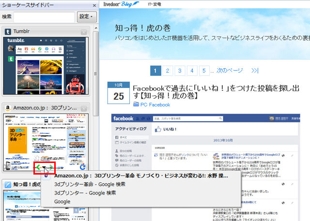 サムネイルからタブを選択できるだけでなく、そのページの履歴にまでアクセスできる『Showcase』。便利なのでぜひ利用しよう。