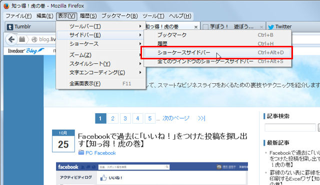 『Showcase』をインストールしたら、[表示]-[サイドバー]-[ショーケースサイドバー]を選択する(画面1)。