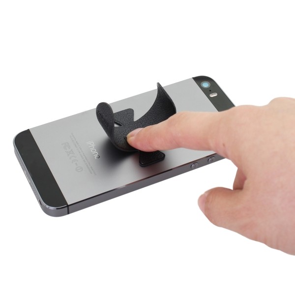 この商品を簡潔に説明すると、iPhoneやスマホの背面に貼り付けるスタンド機能を持つステッカーだ。スタンドの真ん中部分を押すだけで、両側部分がくるっと丸まりスマホスタンド用の脚が登場。使わないときはその脚を閉じておけるので、貼り付けたままでも邪魔にならない。しかも価格は499円と安い。