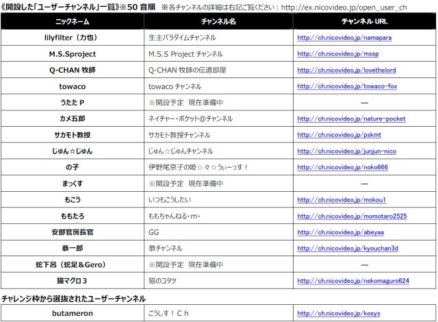 株式会社ドワンゴ及び株式会社ニワンゴは、両社が運営する日本最大級の動画サービス「niconico」の「ニコニコチャンネル」にて12月9日より、一般ユーザー向け専用プラットフォーム「ユーザーチャンネル」(β期間)の第一弾公募から選ばれた17チャンネルをスタートした。また、2014年1月14日(火)より、第二弾「ユーザーチャンネル」募集を開始する予定だ。