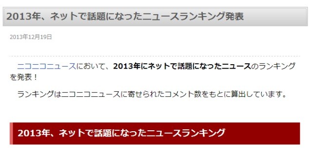 株式会社ドワンゴ及び株式会社ニワンゴは、両社が運営する日本最大級の動画サービス「niconico」内の「ニコニコニュース」において、2013年に配信したニュースのコメント数ランキングが決定した。ITライフハックもニコニコニュースへの記事配信を行っており、2014年にはランキング入りを狙いたいところだ。