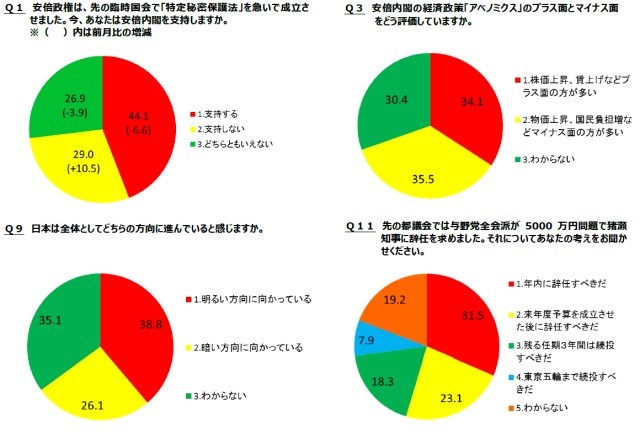 安倍政権に対する支持率は50.7%が支持すると回答し政権発足からおよそ1年経って高水準での支持率となっている。昨年末に政権交代してから始まったアベノミクスに対し「マイナス面多い」と回答した人が35.5%、対して「プラス面多い」と回答した人が34.1%で拮抗しており、株価の上昇はあったものの景気の回復感が国民全体にまで浸透するにはまだまだ経済的な恩恵が足りていないということなのだろう。2014年は消費税や軽自動車税の増税なども控えており、より一層の景気対策が求められる年になりそうだ。