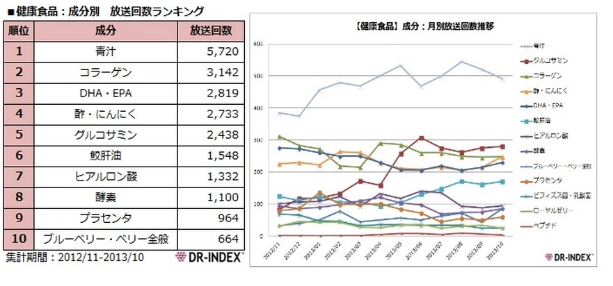 定番商品の強さだけでなく、たとえば5位の「グルコサミン」を見てみると、新商品の登場により4月以降から急激に放送回数が増加し、10月時点で「青汁」に次ぐ2位まで伸びている。逆に3位の「DHA・EPA」は年間では3位だったものの、減少傾向となった。