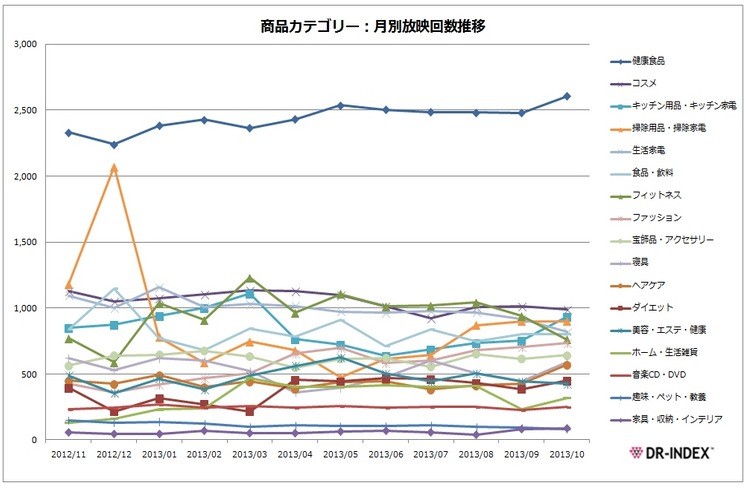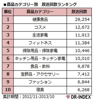 ダイレクトマーケティングを支援する株式会社トライステージは、同社の持つテレビ通販番組データベースである「DR-INDEX」を活用し、2012年11月から2013年10月にかけての全国5地区(関東、関西、名古屋、福岡、札幌)地上波系列局、独立U局、およびBSデジタル放送局、合計37局におけるテレビ通販番組の放送枠の調査を実施し、その結果をまとめた。