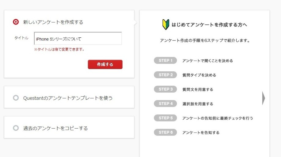 今回は、完全に新規で作成するので「新しいアンケートを作成する」にチェックしたら、アンケートのタイトルを入力する。この例では「iPhone 5シリーズについて」としているが、何に関するアンケートなのかをわかりやすい表現で記入することがポイントになりそうだ。タイトルは後から修正することもできるので、ひとまずアンケート内容がわかるタイトルを付けて「作成する」をクリックしよう。