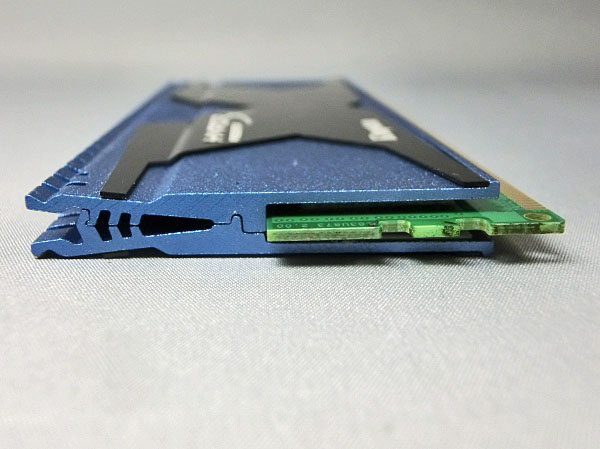 ヒートシンクのない普通のメモリーモジュールと並べてみるだけで、その違いが容易に理解できるだろう。このヒートシンクはインパクトを出すためのものではなく、高クロック動作時のモジュールの発熱を効率よく放熱して安定動作を確保するためだ。もちろん通常クロックでの動作時も、このヒートシンクがあることで、安定動作につながっている。