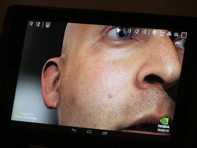 Unreal Engine 4で部屋の中での床の照明の反射、ソファーなどの質感なども本物さながらに再現できてている。また、人間の顔のデモでは、実際の皮膚をリアルタイムにシミュレートし、CGであると説明されないと本物と区別がつかないような映像を公開していた。