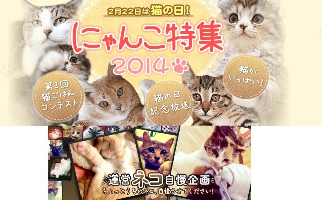 株式会社ドワンゴ及び株式会社ニワンゴは、両社が運営する日本最大級の動画サービス「niconico」にて、来る2月22日の猫の日に合わせて「猫ごはんコンテスト2014」や猫カフェからの生中継、猫映画の一挙放送など「にゃんこ特集2014」を行う。ニコ動では、ねこ鍋動画など、ねこ人気が高く、ニコニコ生放送でも、ニコ生クルーズが来た時にペットの猫を映すだけで完走してしまうなんていう話も聞こえるほどだ。猫特集の概要は以下