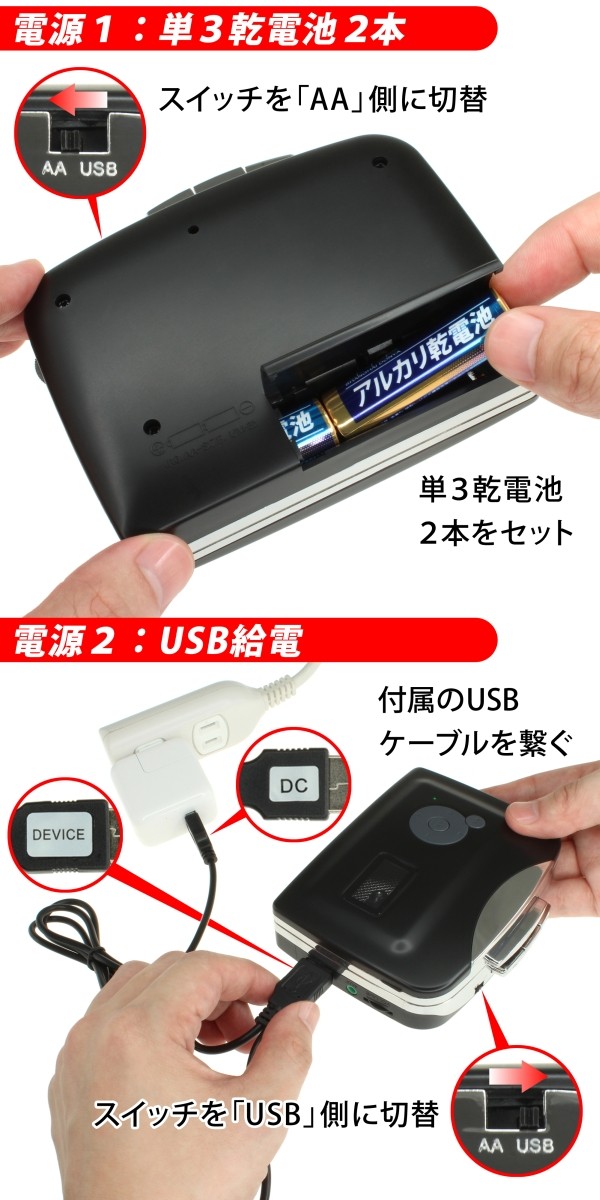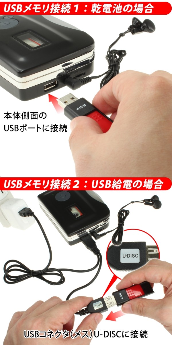 | 乾電池動作とUSB動作でUSBメモリーの差し方が異なる。 |