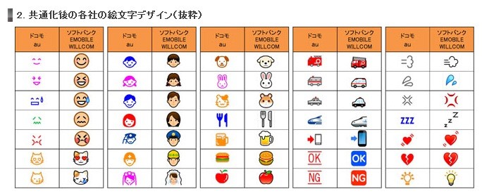 株式会社NTTドコモ、KDDI株式会社、沖縄セルラー電話株式会社、ソフトバンクモバイル株式会社、イー・アクセス株式会社、株式会社ウィルコムの携帯電話・PHS事業者6社は、2014年5月以降順次、事業者間のキャリアメール、SMSでやり取りされる絵文字の数と種類を共通化することを発表した。