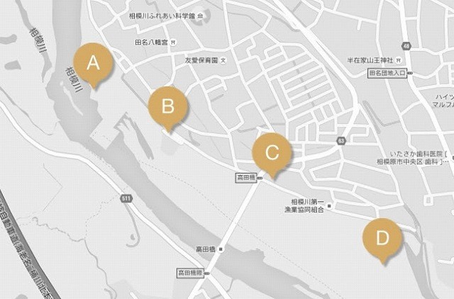 第44回相模原納涼花火大会での撮影スポットは、「A 川沿い」、「B 有料観覧席」、「C アメニティタワー」、「D 駐車場」の4か所を予定。