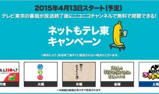 式会社ドワンゴ及び株式会社ニワンゴは、両社が運営する日本最大級の動画サービス「niconico」の「ニコニコチャンネル」で4月13日(月)より、テレビ東京の人気5番組を放送終了後に無料配信することを決定した。
