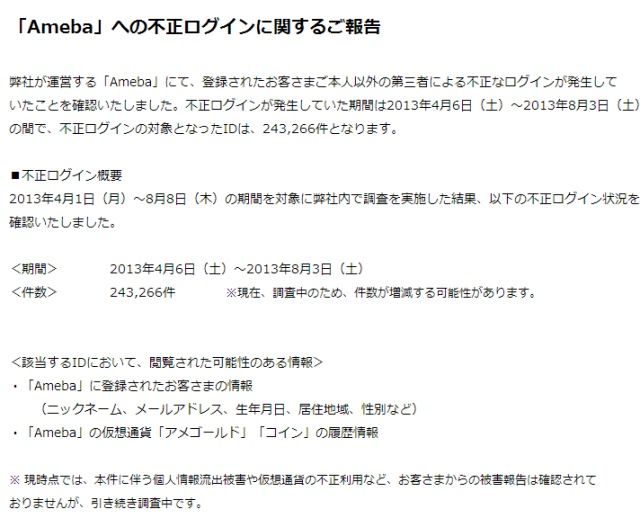 昨日、Amebaを運営するサイバーエージェントから不正ログインに関する報告があった。弊社が運営する「Ameba」にて、登録されたユーザー以外の第三者による不正なログインが発生していたことを確認したという。不正ログインが発生していた期間は、2013年4月6日(土)~2013年8月3日(土)の間で、不正ログインの対象となったIDは、24万3266件に上る。